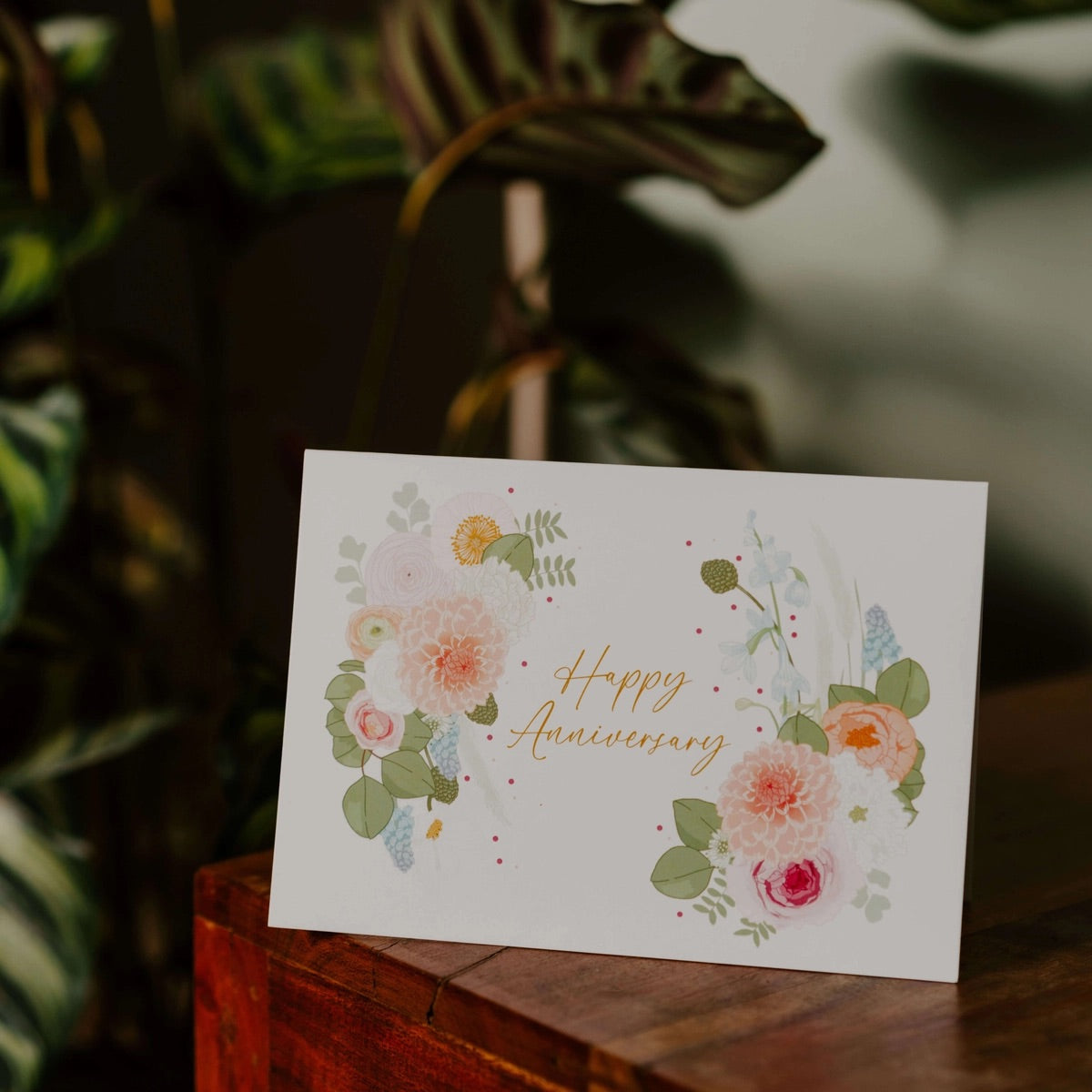 A beautiful anniversary card with lovely pastel blue and peach floral colours.
