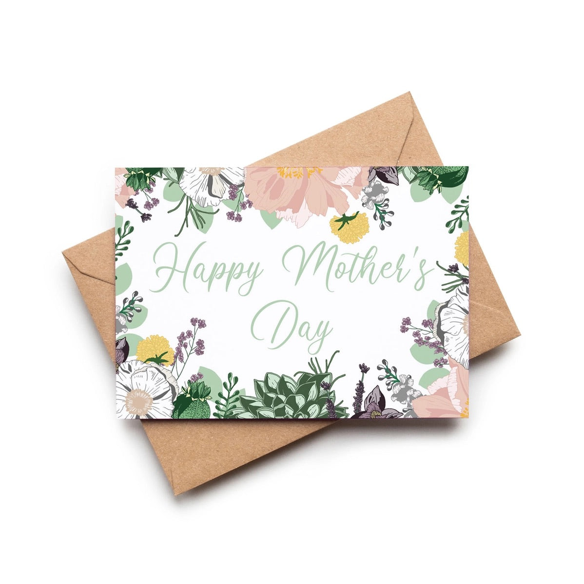 A hand written message 'Happy Mother's Day' framed by pretty florals in pastel and mint green colours.