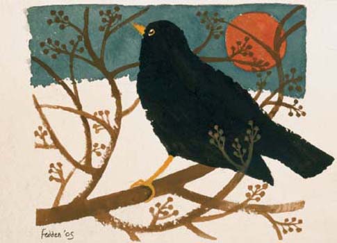 A beautiful blackbird perched in a snowy woodland.