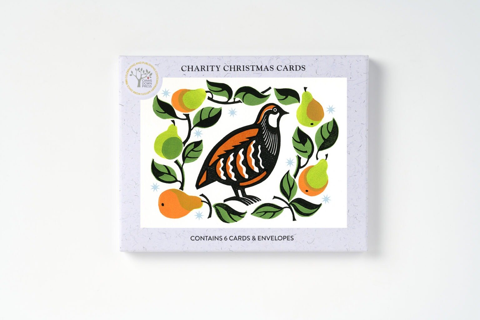 A colourful partridge in a pear tree for Christmas by printmaker Josephine Sumner.