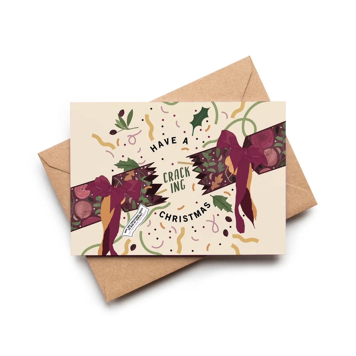 Start the Christmas celebrations with a cracker being pulled, in lovely jewel tones of burgundy and dark greens on a cream background.
