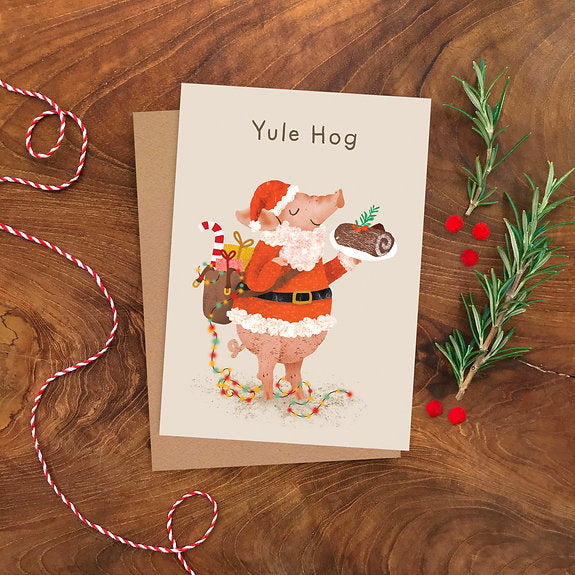 A whole lot of play on words in this Christmas card, yule hog, yule log, a pig Santa, lots of things to raise a festive smile!
