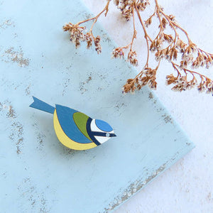 The charming little blue tit is the inspiration for this brooch design. It is cut from FSC certified sustainable birch and painted entirely by hand using eco-friendly Farrow and Ball colours.